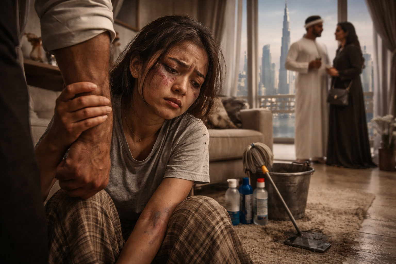 Dounia’s relationship with her Filipina domestic worker, Flora, becomes the novel’s most disturbing—and most revealing—thread. Flora arrives already marked by loss: her infant son has recently died in a hurricane back home. Like many migrant domestic workers, she has come to the Gulf under the kafala sponsorship system, which ties a worker’s legal residency to their employer.